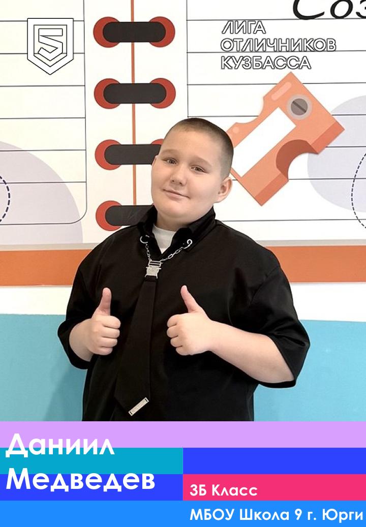 Здравствуйте! Меня зовут Даниил Медведев, я учусь в третьем классе школы № 9 города Юрги. В начале второго класса мама мотивировала меня учиться хорошо с помощью подарков, поездок и игрушек. Но к концу триместра у мамы не было возможности поощрять меня, и я решил, что всё равно буду учиться хорошо, потому что это радует маму. Мне нравится учиться, в школе я общаюсь с друзьями, проявляю себя, ем вкусный обед и получаю незабываемые впечатления.