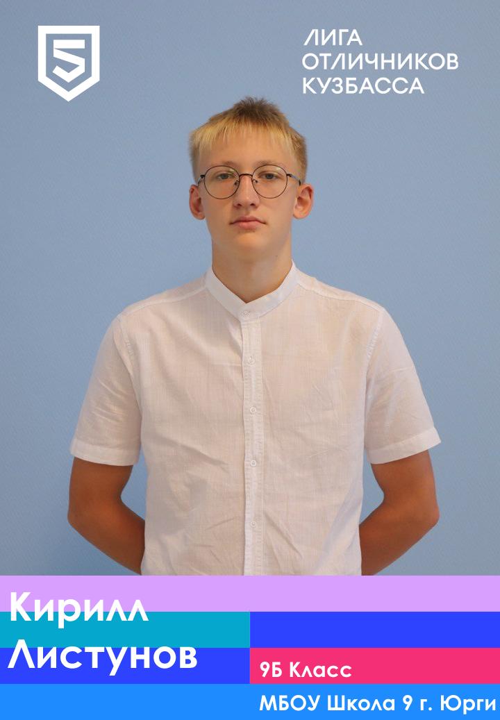 Всем привет! Меня зовут Кирилл Листунов, я перешёл в 9 класс школы № 9 в Юрге. Быть отличником для меня несложно, потому что я просто стремлюсь к тому, чего хочу. Я уверен, что в будущем буду отличником. Моя цель — закончить 11 класс с отличием, и я иду к ней.