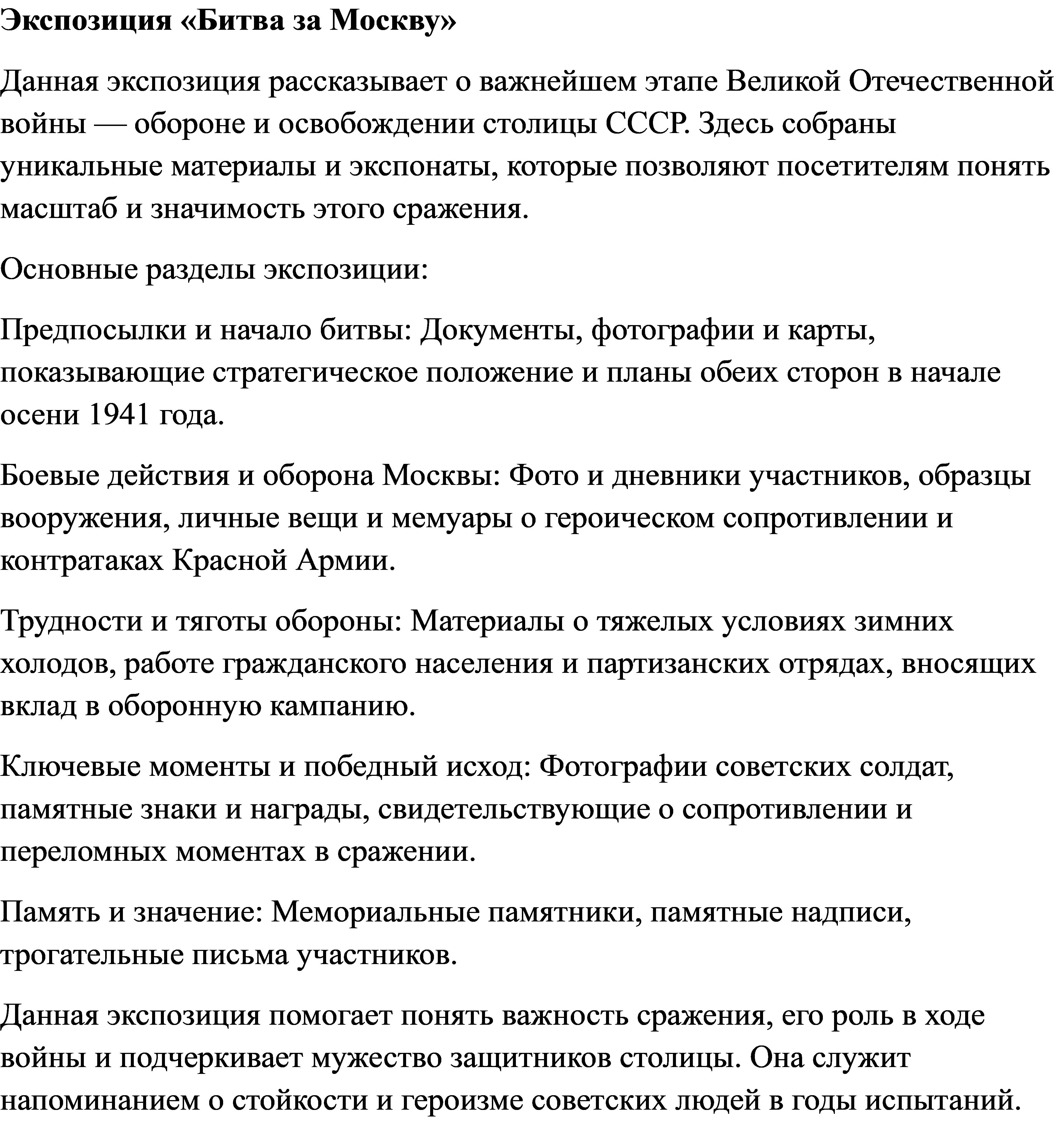 Экспозиция подчеркивает стойкость народа, героизм защитников и важность этой победы для судьбы России и мира